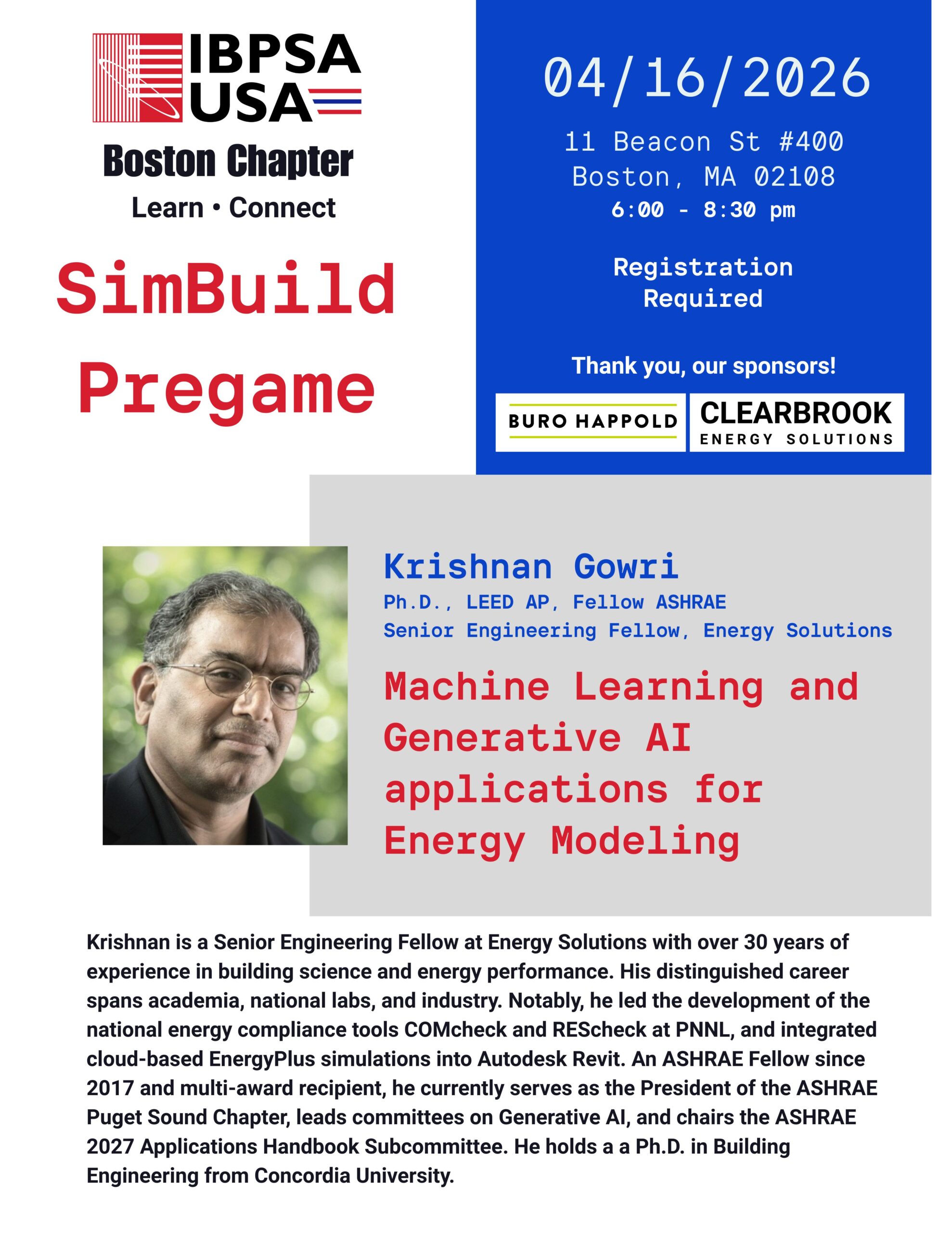 Join the IBPSA-USA Boston Chapter to “Learn & Connect” at our special SimBuild Pregame event! We are thrilled to host industry expert Krishnan Gowri for a deep dive into how artificial intelligence is transforming building performance analysis.